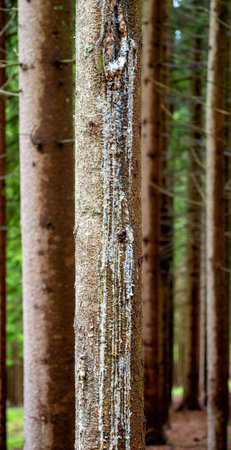 tree resin leaks white out of the trunk of a conifer, Austria