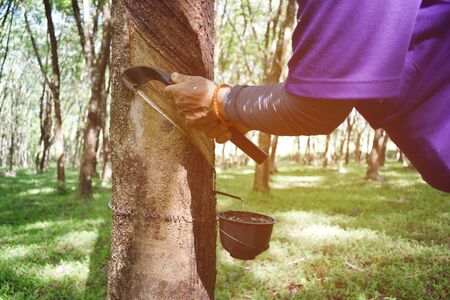 Close-up of rubber planters are tapping rubber with a rubber tapping knife in the morning with selective focus.