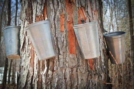 Pails in trees to collect sap of maple trees to Produce maple syrup.