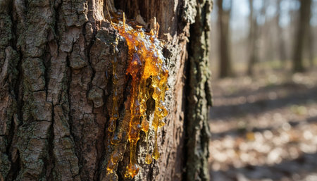 Many drops of resin on a tree trunk