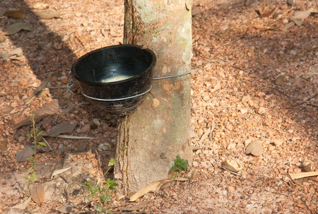 Rubber latex extracted from a rubber tree into a bowl, Thailand.