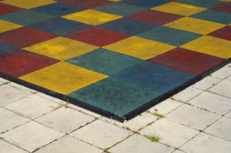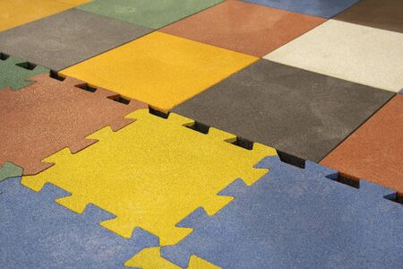 Close up of soft rubber tiles for covering at outdoor gym of stadium at preschool yard.