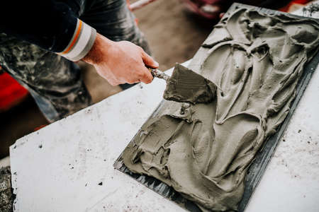 Industrial worker, builder working on stone tiles. Details of worker using mortar for stone installation