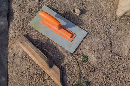 construction equipment dirty red yellow trowel used for masonry on rough unfinished concrete surface with copy space