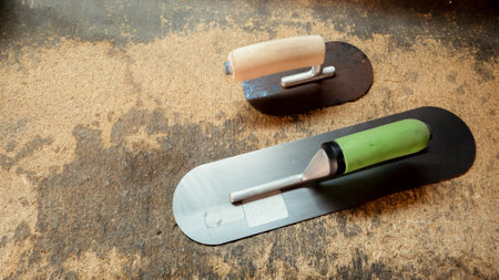 Construction metal spatulas in mortar after work. Dirty tool on craft brown paper. For laying tiles, cement, grouting and more. Indispensable for home renovation. Metal and plastic