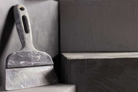 Construction trowel tool at cement background. Mason tools on concrete wall