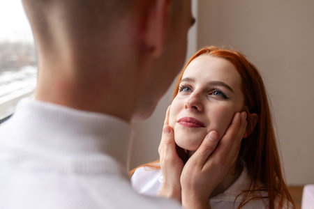 young serious couple looking into eyes closely, woman in eye contact with man