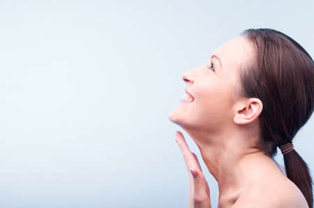 happy young woman is looking upwards on blue background