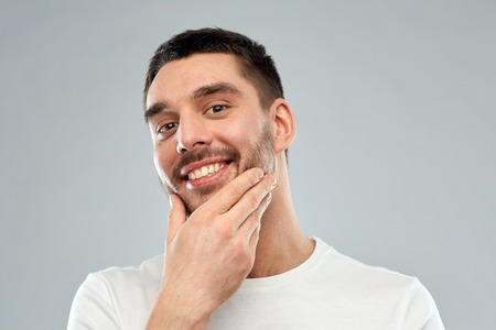 beauty, skin care, grooming and people concept - happy young man touching his face or beard over gray background