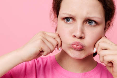 Close up portrait of young woman in funny expression, pinches her cheeks, showing how big they are, wearing casual blue t shirt, standing over yellow background