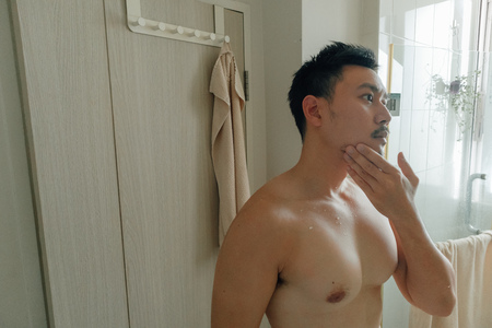 Asian man with beard is checking his face in the bathroom. Concept of healthy man.