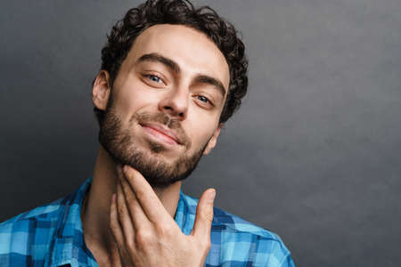 Bristle man dressed in shirt touching his chin while looking at camera isolated over grey background