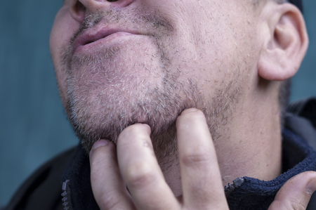 Matured sneering man scratching his unshaven chin, outdoor cropped shot