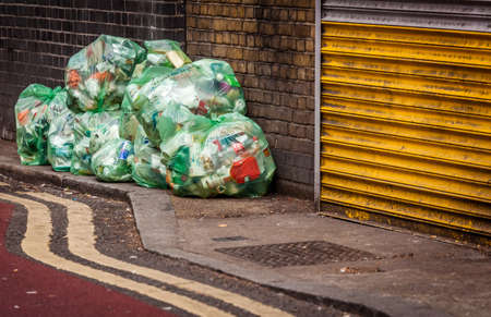 Pile of garbage bags full of plastic bottles and other trash isolated on white background