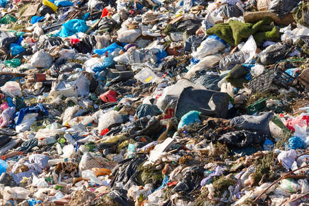 Pollution concept. Garbage pile in trash dump or landfill. Garbage dump, various trash and waste material, environmental pollution and ecology concept, selective focus