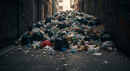 An urban alley presents a chaotic scene, featuring a mound of garbage illuminated by soft light, highlighting issues of waste and neglect in city landscapes.