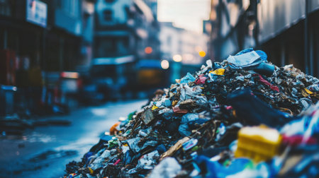 A striking urban cityscape image reveals the extensive accumulation of plastic waste on the streets, emphasizing environmental concerns and the impact of urban pollution.