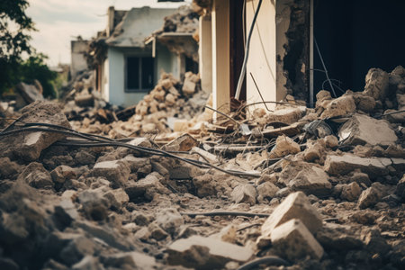 Aftermath of a demolition with piles of shattered concrete and twisted rebar forming a debris scene.