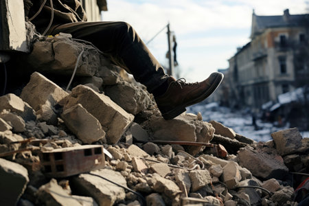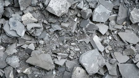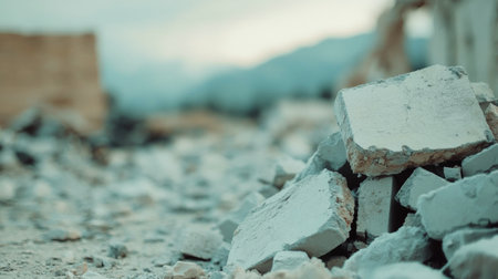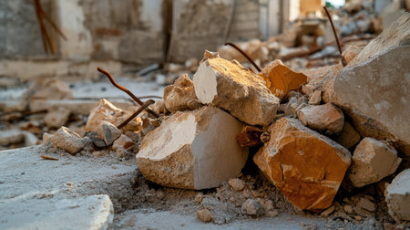 Close-up of broken concrete pieces, highlighting the aftermath of building demolition