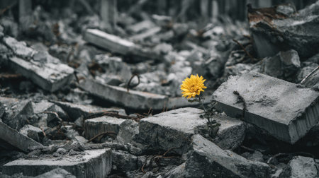 Single bright yellow flower is seen growing amidst large pieces of gray concrete debris. The image evokes themes of resilience and strength in the face of destruction.
