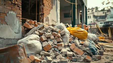 A close-up view of a chaotic construction site featuring a large pile of bricks and bags, symbolizing urban renovation or demolition activities.