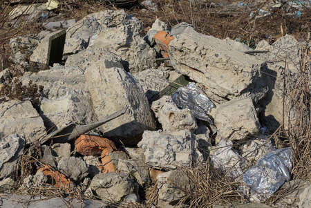 Сonstruction garbage, debris and waste rubble in a remote green area. Nature and soil pollution concept