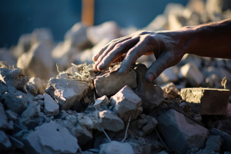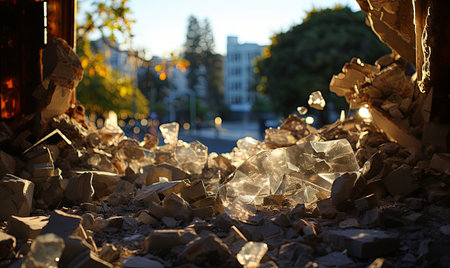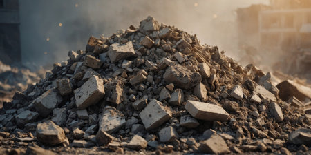 Pile of broken bricks and debris at a construction site, showcasing urban decay and renewal with warm sunset lighting
