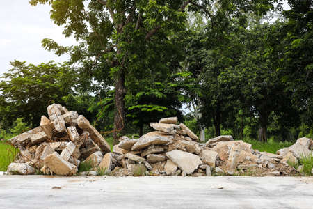 View of the rubble pile of concrete blocks demolished from the road surface and dumped in a cement yard near a forest in rural Thailand to be re-used in a landfill.