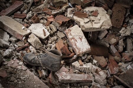 Abandoned boot on a pile of brick rubble