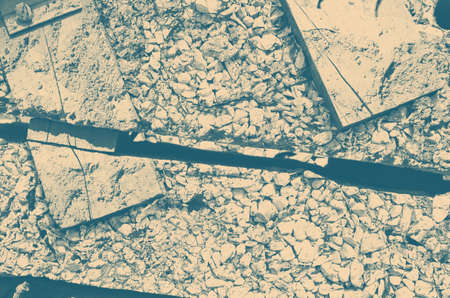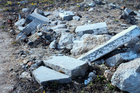 A pile of gray concrete debris from the pile and stones of the destroyed building. Impact of destruction Background.