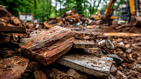 A detailed close-up of various debris and wood pieces at a demolition site, showcasing construction materials and machinery in a natural setting.