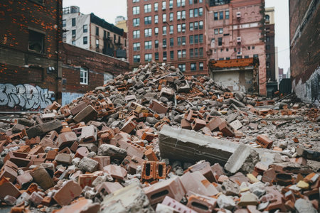 A close-up view of a pile of bricks and debris scattered on a construction site, showcasing the rugged textures and urban background under a cloudy sky.