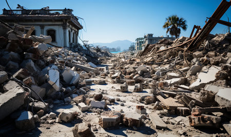 AI Generated. Devastated urban cityscape covered in dust and rubble after a massive destruction event