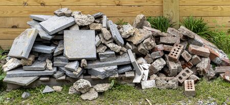 A pile of construction waste near private house. Building rubble, bricks, stones. Junk, garbage piled up near the building. Street scene. Recycling industry, rubbish removal and collection service