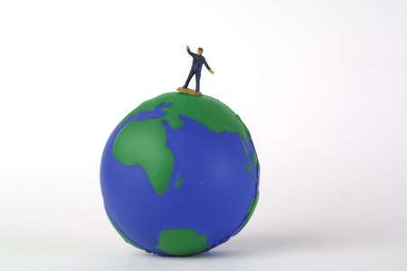 Top view men and women miniature people stand on a world map background. Geopolitics concept.
