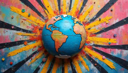 A striking globe of Earth is centered against a backdrop of explosive colors, radiating vibrant rays of yellow, orange, and pink. This artistic representation symbolizes unity and the interconnectedness of our world, inviting viewers to celebrate diversity and global harmony.