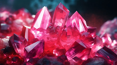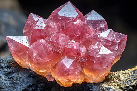 A vibrant pink quartz crystal cluster displays striking geometric shapes, resting on a contrasting dark rock. ideal for geology enthusiasts and gemstone collectors, natural beauty and mineralogical interest. Generative AI