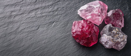 Pink and red crystals rest on a textured dark slate surface showcasing their vibrant colors and natural shapes.