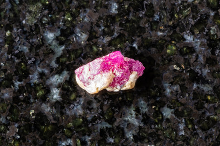 sample of raw pink ruby mineral on black granite background close up from Pakistan