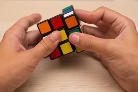 MADRID, SPAIN - SEPTEMBER 13, 2021. Close-up of hands solving a Rubik's Cube. Color puzzle.