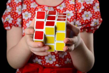 Almetyevsk City, Russia - February 7, 2017: a little girl holding a Rubik's cube on a black background