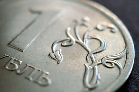 A fragment of a Russian coin in 1 one ruble close-up. Focus on floral ornaments. A dark dramatic and impressive illustration on the topic of the economy, finances and banks of Russia. Macro