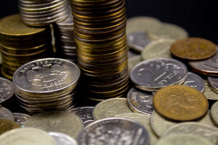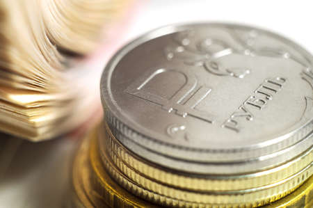 Russian ruble coin close-up. Business concept of rich, wealth, profit and finance background. Stack of money coins