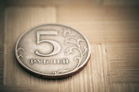 Russian coin - five rubles, macro shot with selective focus Color toned image