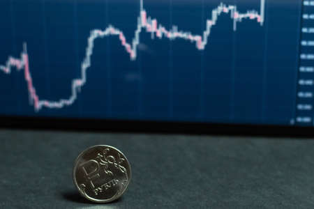 Ruble coin against the background of the growth graph of the ruble to dollar exchange rate. The concept of overcoming the economic crisis.