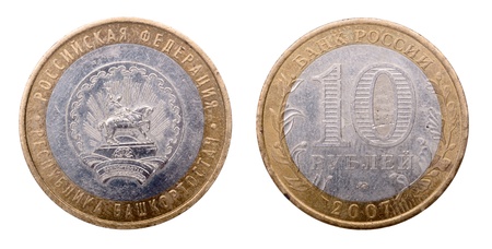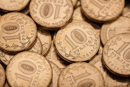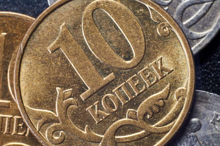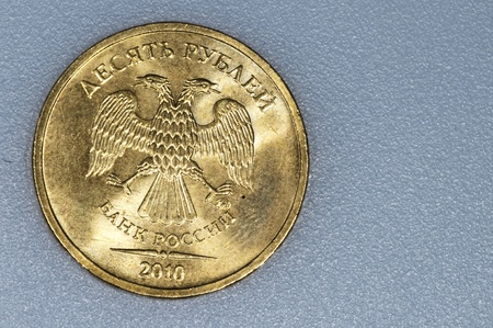 Russian coin - ten rubles, macro shot with selective focus and shallow depth of field.