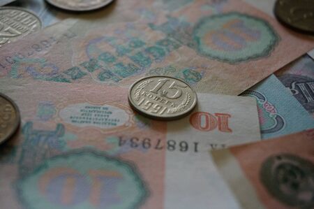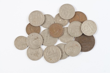 Old USSR money close-up on a white background, isolated. Macro photography of retro coins of the Soviet Union, vintage details