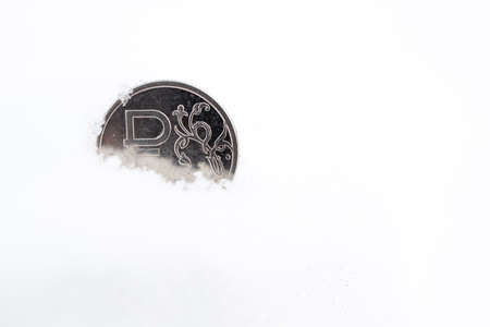 metal ruble in the snow, part of the ruble fell into a snowdrift. Russia's freezing economy