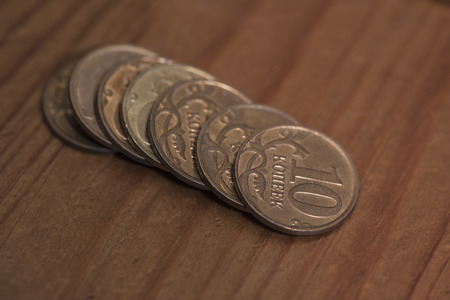 Silver coins on dark background. Ukrainian 10 hryvnias coins. Money and finances. Ukrainian coins