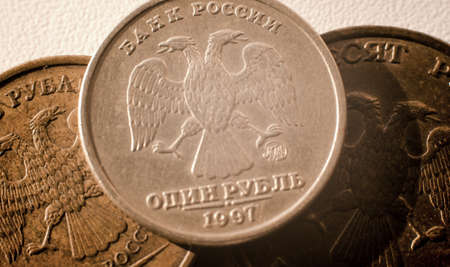 Coins Russian rubles background. Translate: Ruble, Russian Federation